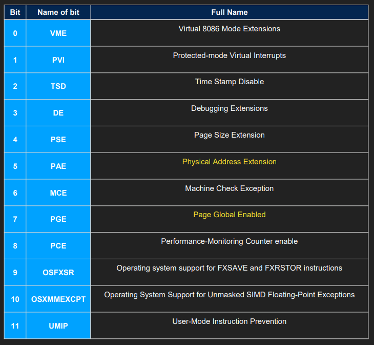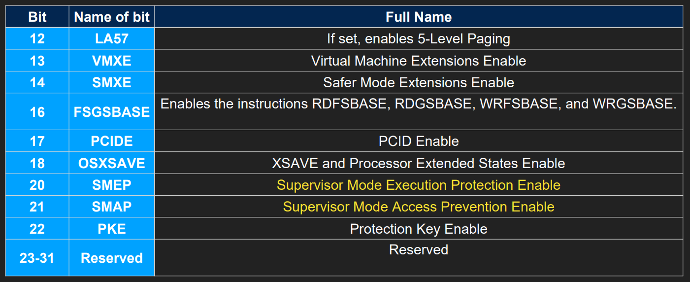 - CR4:控制 Protected mode 操作 (如 SMEP/SMAP 相關)