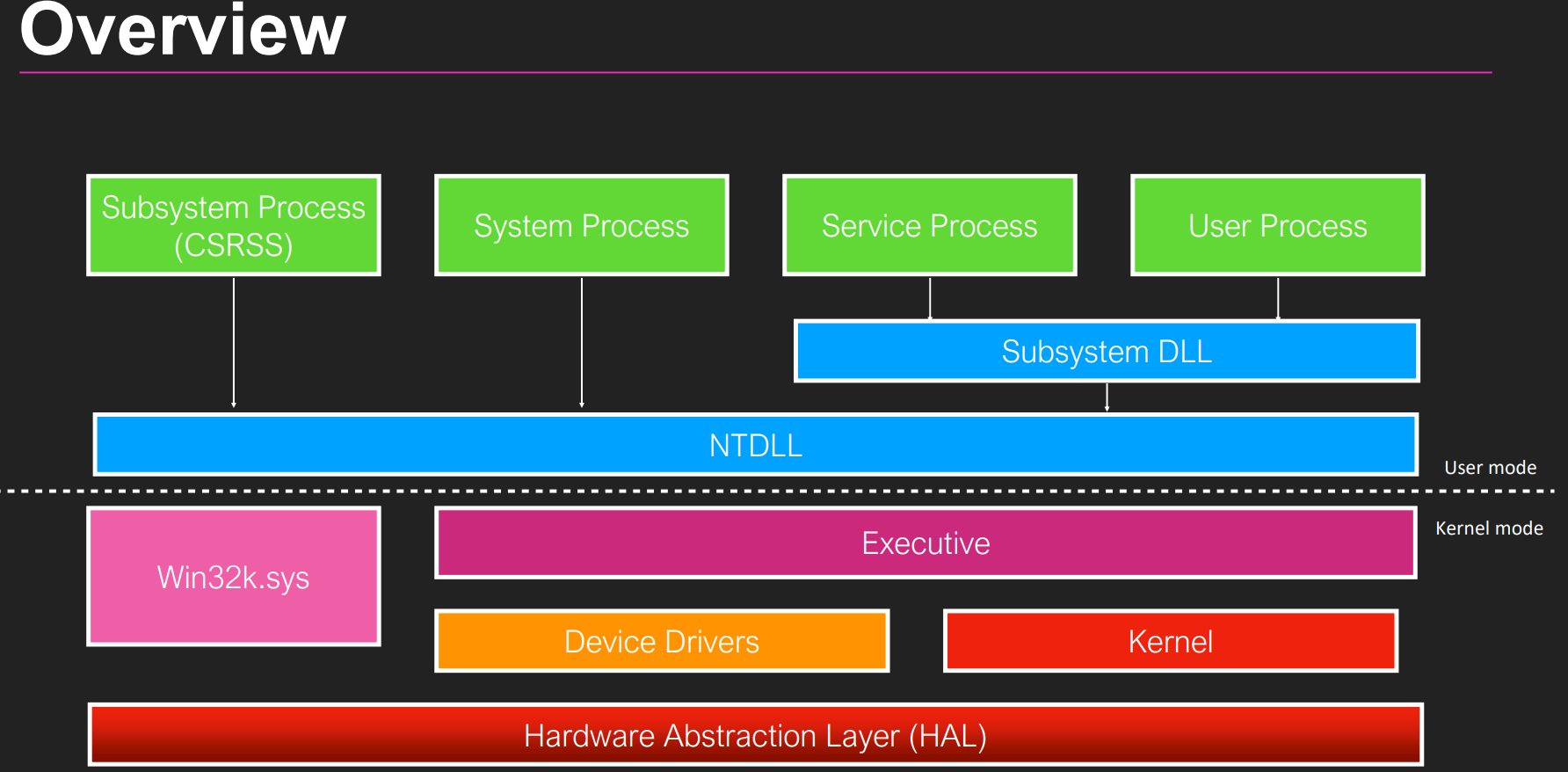 - Dispatch/DPC Level (2):Kernel scheduler, Page fault handler. 此層級以上不可發生 Page fault (僅能存取 Non-paged memory)