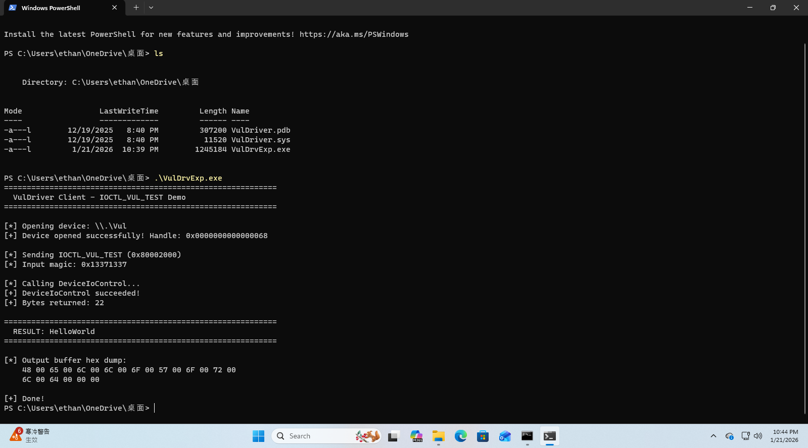0: kd> lm vm VulDriverBrowse full module liststart end module namefffff805`30240000 fffff805`30248000 VulDriver (private pdb symbols) c:\localsymbols\VulDriver.pdb Loaded symbol image file: VulDriver.sys Image path: \??\C:\VulDriver.sys Image name: VulDriver.sys Browse all global symbols functions data Symbol Reload Timestamp: Fri Dec 19 20:40:23 2025 (694547B7) CheckSum: 0000DCD0 ImageSize: 00008000 Mapping Form: Loaded Translations: 0000.04b0 0000.04e4 0409.04b0 0409.04e4 Information from resource tables:利用 DeviceIoControl 與 driver 互動